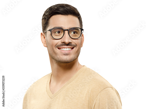 man, looking, away, t-shirt, goggles, white, isolated, background, goal, aside, portrait, male, young, man, business, face, success, smile, confident, casual attire, guy, model, copy, turning, happy, smart, caucasian, space, confidence, smiling, people, fashion, 20s, beige, brown, dream, looking away, eyewear, modern, from, camera, right, optic, advertisement, spectacle