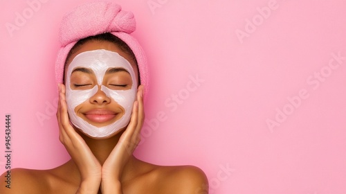 horizontal image, a portrait of a woman in a spa, pink isolated background. With copy space for text. Skincare treatment concept. For banner, design, salon, clinic, cosmetologist, web, promo