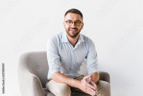 Horizontal portrait of attractive caucasian guy wearing stylish formal clothing sitting in armchair and looking ahead with smile, isolated over white background
