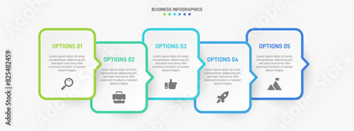 Horizontal progress bar featuring 5 arrow-shaped elements, symbolizing the five stages of business strategy and progression. Clean timeline infographic design template. Vector for presentation