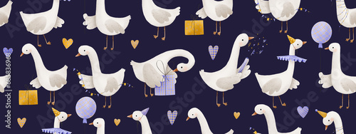 Horizontal seamless Birthday pattern with funny duck. Ducks celebrating a Birthday with balloons, gift boxes and confetti. Hand drawn cartoon illustration of festive elements and funny characters.