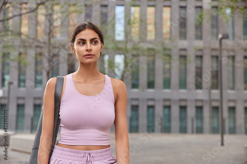 Horizontal shot of determined thoughtful woman in sportswear focused into distance carries rubber rolled karemat poses against modern building prepares for workout session. Healthy lifestyle