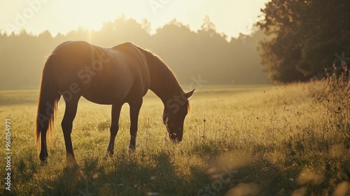 horse, grazing, grass, field, sunset, gold, hours, meadow, nature, rural, farm, countryside, equine, animal, wildlife, silhouette, landscape, pasture, morning, dawn, light, sun, ray, warm, calm, peaceful, serene, tranquil, beautiful, green, yellow, brown, photo, wide, angle, outdoors, farmland, summer, day