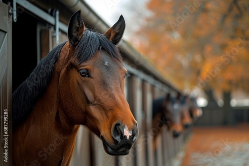 horse, stable, stall, equine, animal, farm, brown, black, mane, face, head, door, wood, fence, eye, ear, muzzle, nose, tail, foal, colt, mare, pet, domesticated, mammal, hoof, rider, grooming, horseshoe, hay, eat, graze, riding, equestrian, pasture, field, grass, barn, country, rural, autumn, fall, leaf, tree, outdoors, nature, photo, daylight, portrait