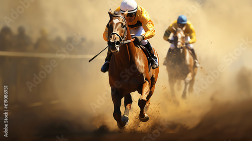 Horse races, jockey and his horse goes towards finish line. Traditional European sport., Generative Ai