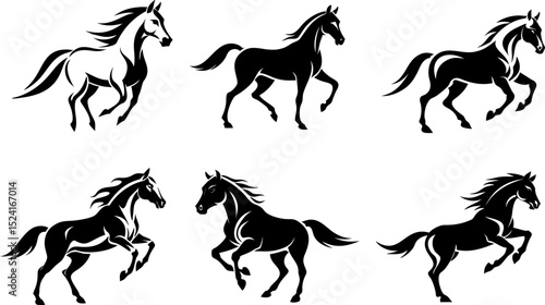 horse, silhouette, icon, set, galloping, jumping, running, pose, white, animal, vector, black, collection, wild, race, equestrian, fast horse, design, graphic, isolated, shape, motion, spirit, dynamic, fast, freedom, nature, power, speed, movement, sport, outline, modern, minimalist, simple, flat, symbol, concept, action, grace, strength, purity, elegance, energy, artistic, abstract, digital, rearing