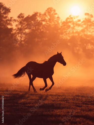 horse, running, galloping, silhouette, field, mist, fog, sunrise, gold, light, dawn, animal, equine, mare, fast horse, landscape, nature, rural, outdoors, freedom, energy, power, movement, grass, tree, morning, warm, sun, countryside, pasture, meadow, peaceful, tranquil, scenic, beautiful, wild, wildlife, mammal, beast, strength, athletic, equestrian, foggy