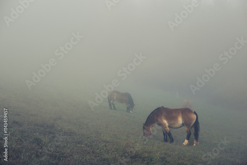 Horses graze in a field in thick fog on a hillside. Pasture in the early morning, silhouettes of cows and horses emerge from the fog