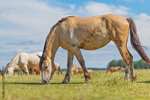 Horses graze in the meadow on a summer day.