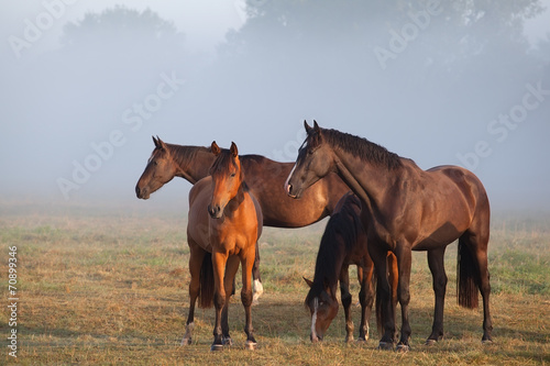 horse, few, herd, brown, pasture, pastoral, graze, fog, mist, misty, sunlight, sunshine, sunny, sunrise, early, morning, view, scenery, scenic, season, summer, farmland, rural, animal, farm animal, countryside, landscape, nature, no people