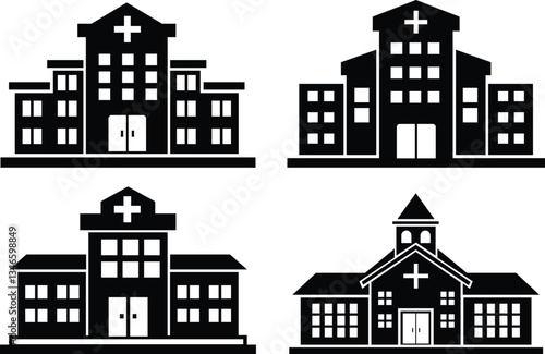 Hospital building icon set.Vector of medical clinic, polyclinic logo. Health care building exterior illustration.Clinic with medical pictogram. Symbol, logo illustration.