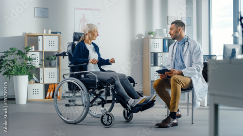 Hospital Physical Therapy: Strong Senior Female in Wheelchair, Talks to a Friendly Rehabilitation Physiotherapist Doctors Gives Advice, Plans Rehabilitation Treatment for Determined Disabled Patient