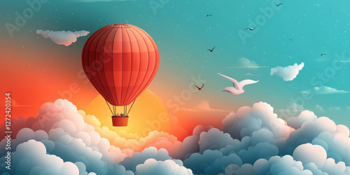 Hot air balloon above clouds. Adventure, travel, journey background