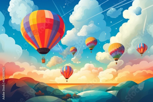 expressive, ambiguous, experimental, abstraction, abstract, art, illustration, hot, air, balloon, summer, colourful, floating, blue, sky, festival, picturesque, scene, whimsy, dancing, majestically, canvas, vibrant, hue, artist, joy, wonder, airborne, spectacle, dream, cloud, professional, visual, designer, photographer, creative, imagery, skilful, craftsmanship