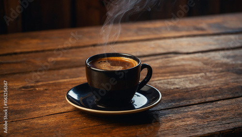 Hot black coffee in a ceramic mug, placed on a rustic wooden table with a cozy, warm background.