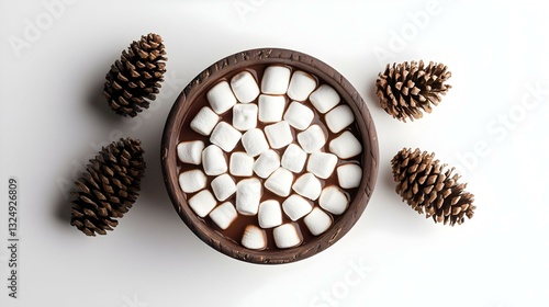 white background, hot chocolate, pine cone, winter, cosy, warm, drink, beverage, sweet, dessert, holiday, christmas, autumn, fall, food, delicious, tasty, treat, comfort food, cocoa, chocolate, creamy, fluffy, festive, seasonal, relaxing, mug, cup, bowl, topview, isolated, background, photo, image, picture, visual, comforting