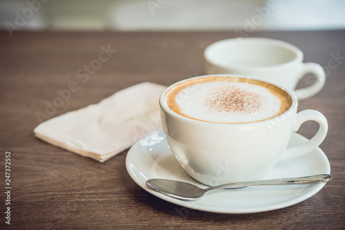 Hot coffee and hot tea place on the wooden table in early morning with copyspace, white cup and silver spoon.