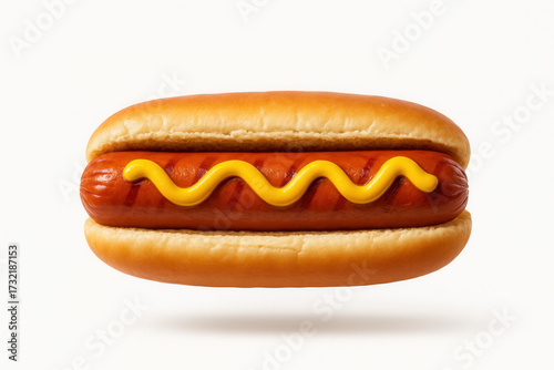 Hot dog with mustard on a soft bun.