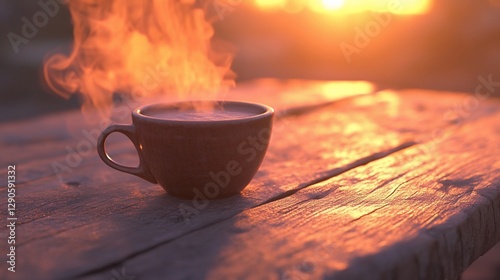 Hot drink steaming on wooden table at sunset.