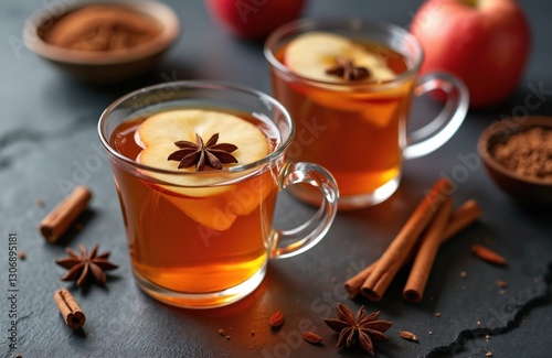 Hot mulled apple cider with cinnamon sticks, anise stars served in glass mugs. Warm winter alcohol beverage with spices, apple slices, orange zest, sugar. Comforting fruity holiday drink for cozy