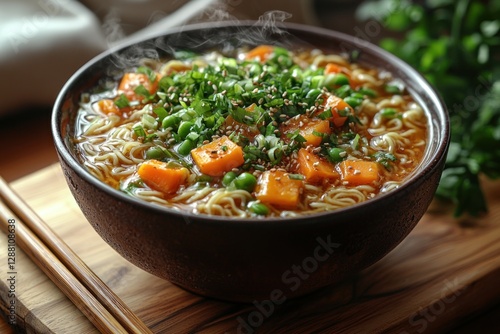ramen, noodle, soup, vegetable, food, dish, asian, cookery, hot, eating, eatery, cooking, crockery, steaming, bowl, japanese, dinner, lunch, meal, healthy, quick, easy, comfort, tasty, appetising, delicious, home, kitchen, table, wooden, background, steam, chopstick, spicey, hearty, fresh, receipe, fast