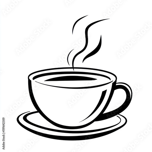 Hot steaming coffee cup, saucer, white background, simple design, menu graphic