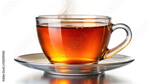 tea, cup, glasses, saucer, hot, beverage, drink, steam, warm, amber, brown, liquid, transparent, clear, isolated, white, background, studio, photo, macro, closeup, detail, refreshment, caffeine, aromatic, infusion, texture, surface, light, shadow, object, single, image, visual, element, composition, design