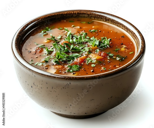 Hot tomato soup garnished with fresh parsley and black pepper served in rustic brown ceramic bowl against white background, ready for food service.