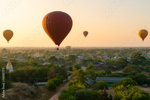Hot-air balloons at sunrise over village near Bagan (Pagan)