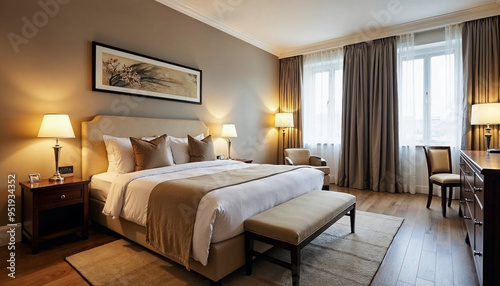 bedchamber, interior, bed, room, hotel, home, house, design, furniture, lamp, window, apartment, luxury, pillow, carpet, decor, nobody, architecture, indoor, comfortable, sofa, light, table, wall, wood
