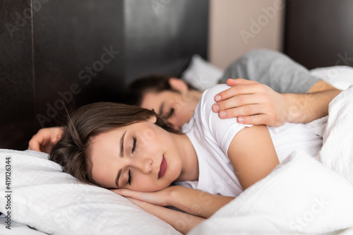 background, family, woman, love, couple, man, beautiful, male, people, female, pillow, attractive, white, young, bed, bedchamber, sleeping, smiling, weekend, married, nap, pajama, 2, together, relaxed, romance, romantic, room, lover, relationship
