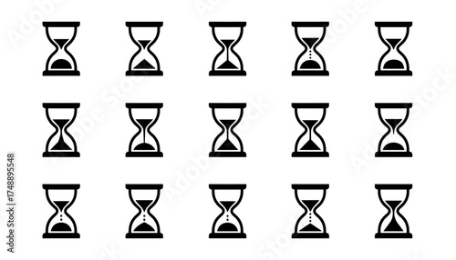 Hourglass icon set. Sandglass timer and sand clock symbol collection. Time passing, countdown, deadline concept. Vector flat black silhouette animation frames isolated on white.