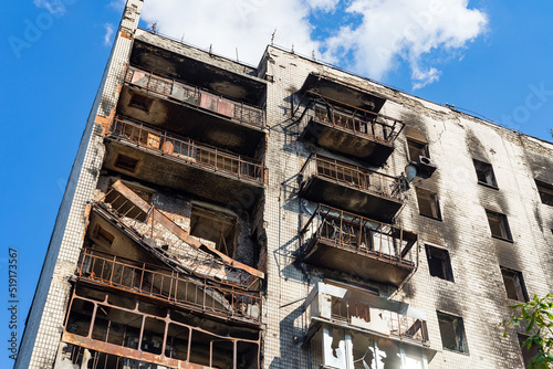 House in of civilians destroyed by russian army in the suburbs of Kyiv (Irpin). Traces on the building from shells. russia's war against Ukraine.