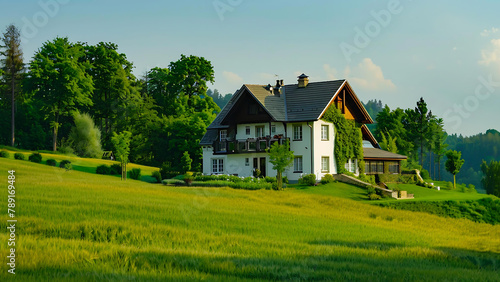 House on a lush green field with a backdrop of trees and a bright blue sky.