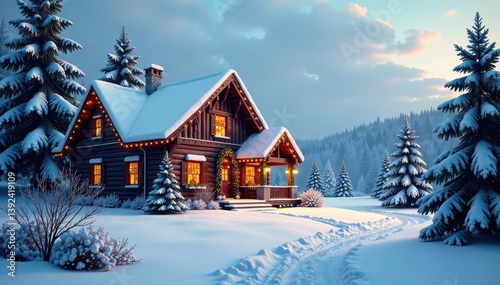 House with festive holiday decorations surrounded by snow-covered evergreen trees in a serene winter landscape, trees, lights