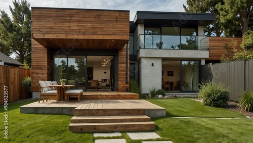 House with outdoor stairs, grassy yard, and outdoor living area, with copy space.