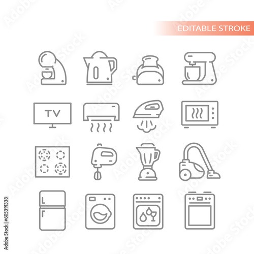 air conditioner, appliance, appliance, blender, cleaner, hot drink, cook, cooking, dishwasher, domestic, electric, equipment, flat, food, refrigerator, home, house, household, icon, icon, iron, kettle, kitchen, machine, microwave, mixer, oven, refrigerator, set, signs, stove, symbol, toaster, vacuum, vector, washing, bold, thin, outlined, outline, line, stroke, editable