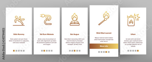 Household Dangers Onboarding Icons Set Vector. Short Circuit And Fire, Flood And Gas Leak, Balloon Explosion And Burning Match House Dangers Illustrations