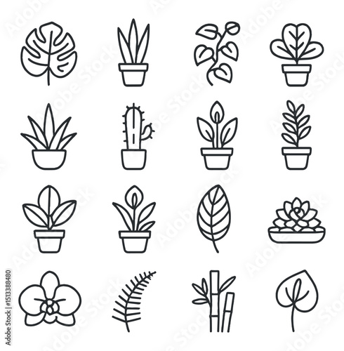 Houseplant icon collection: linear style flora and potted plant symbols set