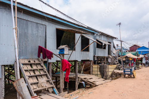 Houses made from corrugated iron on wooden stilts in a poor, rural village with a dirt track road in Cambodia.