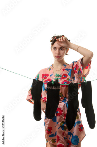 sock, laundry, homemaker, clothing, washing, woman, housework, life, clothes line, cleaned, studio, drying, chore, domestic, textile, string, hanging, rope, clothespin, white, blue, freshness, row, adult, human, wet, activity, hand, clothespin, line, people, 1, female, routine, isolated, tire