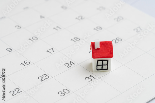 Housing, property or real estate or mortgage payment concept, miniature house with red roof on the end of month 31th date white clean calendar