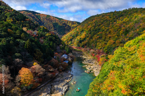 Hozu River in autumn view from Arashiyama view point, Kyoto, Jap