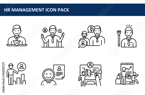 HR Management Icon Pack depicting various HR functions and personnel in a modern office setting.