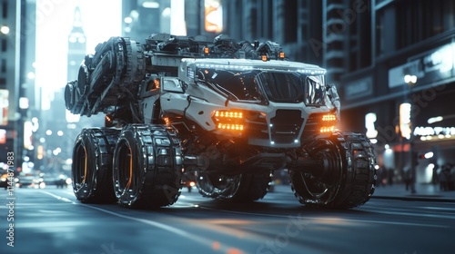 huge autonomous car robot vehicle explores the streets of a cyberpunk city background wallpaper AI generated image