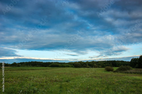 Huge green meadow, forest and clouds