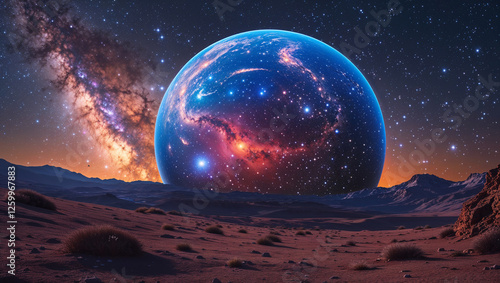 space, planet, desert, landscape, lactic, way, galaxy, star, astronomy, universe, exploration, science, fantasy, fi, extraterrestrial, alien, earth, nature, night, sky, cosmos, red, blue, huge, giant, rising, scenery, scenic, view, panorama, horizon, mountain, terrain, ground, dust, rock, vegetation, light, glow, bright, dark, colourful, vibrant, beautiful, majestic, awe, wonder