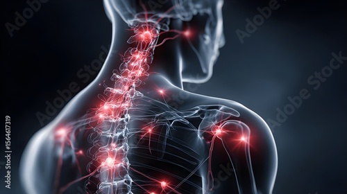 Human body with glowing red pain points on neural pathways illustrating pain or nerve stimulation,