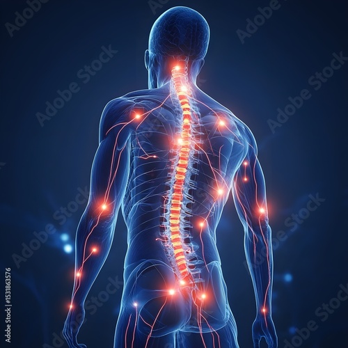 Human body with glowing red pain points on neural pathways illustrating pain or nerve stimulation, set against a dark blue background