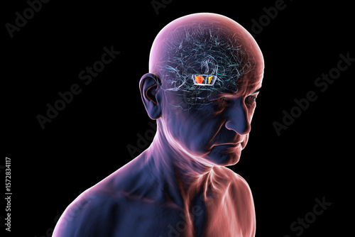 Human brain with highlighted substantia nigra in the midbrain, a key structure involved in movement regulation and affected in Parkinson's disease, 3D illustration.
